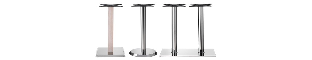Base in acciaio inox composta da zavorra rettangolare in fusione di ghisa con copertura in acciaio inox, doppie colonne in acciaio o legno di faggio a sezione rotonda e crociera sottopiano in alluminio. Inalterabile agli agenti atmosferici. -