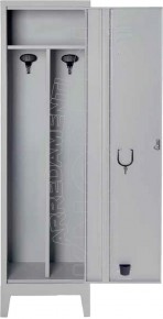 Armadio monoblocco con bordi arrotondati. Ante rinforzate con cerniere interne, feritoie di aerazione superiori ed inferiori, porta cartellino stampato. Serratura a chiave. Ripiano fisso superiore in lamiera con divisore centrale fisso in lamiera.Manina in plastica nera per ogni vano.