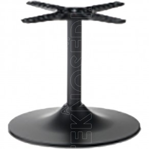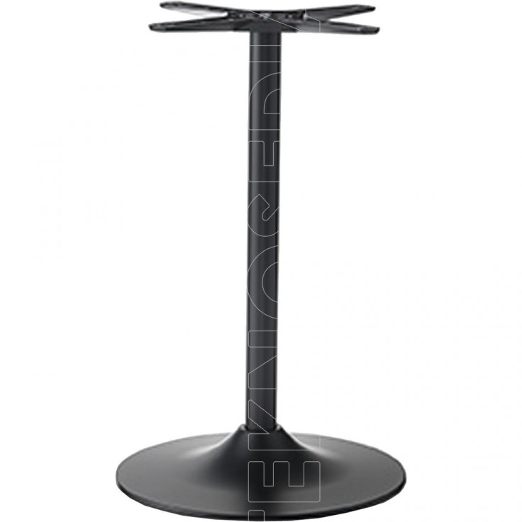 Base tonda realizzata in alluminio verniciata nera e colonna tonda, crociera Star in alluminio. Può essere abbinata a piani di diverse dimensioni e materiali. La base Bugle è nata per soddisfare le esigenze di ambienti polivalenti come Bar, Ristoranti, Pizzerie, Caffetterie. Adatta anche per uso esterno.