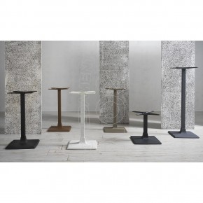 Base in fusione di ghisa quadrata con colonna a sezione quadrata. Può essere abbinata a piani di diverse dimensioni e materiali. Adatta per soddisfare le esigenze di ambienti polivalenti come Bar, Ristoranti, Pizzerie, Caffetterie, Pub.