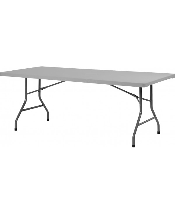 Tavolo pieghevole di eccezionale robustezza. Struttura portante interamente metallica con gambe in tubo tondo mm.28 curvate a freddo, incernierate a barre metalliche sotto al piano con tubo tondo di collegamento Diam. 22 mm. e collegate fra di loro a mm. 250 da terra da tubolare ovalizzato per una eccezionale tenuta e resistenza. Saldato alle stesse gambe con saldature digitali, lineari, precise e indistruttibili. Dispositivo bloccaggio gambe in posizione di utilizzo mediante sezione di tubo ovale 30x15, tali da garantire un' ottima stabilità. Verniciatura a polveri Epossipoliestere finitura bucciata Piano mm.45 di spessore, realizzato in polietilene grigio puro non mescolato di prima qualità, stampato con tecnologia HDPE Blow Moulding (Soffiatura a Sandwich) con nido d'ape profondo mm.22 e protezione ANTI-UV