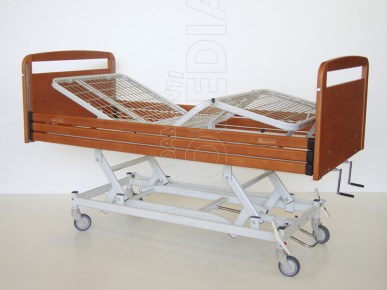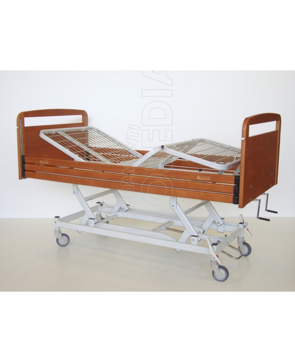 Letto ad altezza variabile costruito in tubolare d'acciaio a sezione ovale. Verniciato a polveri termoindurenti epossidiche. Schienale e femorale regolabili mediante manovelle poste al lato piedi del letto. Sezione gambe regolabili mediante meccanismo a scatto. Testata e pediera in legno massello perimetrale con pannello. Guide per sponde incassate. Sponde in legno a scorrimento verticale con comando di sblocco con sicurezza. Base regolabile in altezza mediante pompa oleodinamica. Predisposizione per asta portaflebo e riggiammalato. Possibilità ruote frenanti singole o ruote con sistema autobloccante-direzionale.