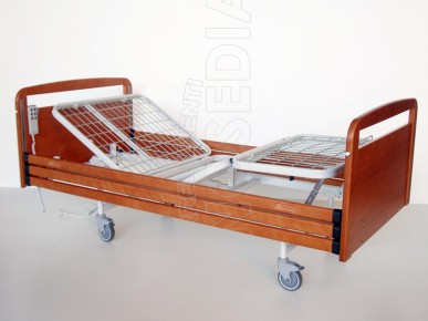 Letto 4 sezioni 3 snodi con movimentazioni schienale e femorale elettriche. Gambale regolabile tramite meccanismo a cremagliera. Costruito in tubolare d’acciaio a sezione ovale e verniciato a polveri termoindurenti epossidiche colore Ral grigio 7035. Rete asportabili in tondino d’acciaio per facilitarne la pulizia. Comodo e pratico telecomando per la gestione movimentazioni delle sezioni. Alla base gambe con puntali in materiale plastico antiscivolo.(possibilità ruote) Testata e pediera in legno massello perimetrale con pannello colore ciliegio. Sponde 3+3 di cui 2 con maniglia a scorrimento verticale con pulsante di sgancio di sicurezza. Predisposizione per asta porta flebo e riggiammalato. Carico di lavoro sicuro 200 kg.