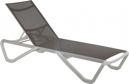 Lettino in polipropilene con schienale regolabile, impilabile, barre laterali di rinforzo in alluminio color bianco. Totalmente sanificabile e resistente agli agenti atmosferici. Linea moderna , leggero, si adatta alla perfezione per arredare giardini e bordi piscine o spazi verdi di hotel o resort