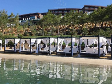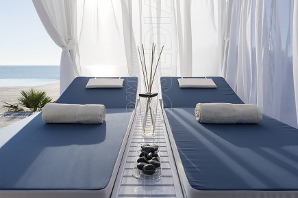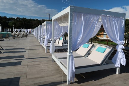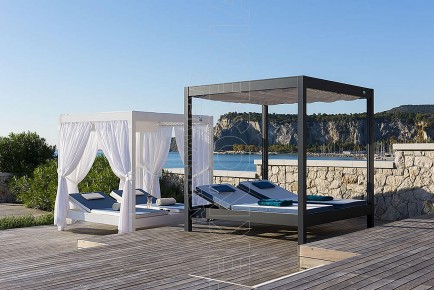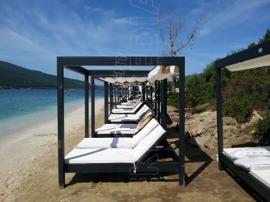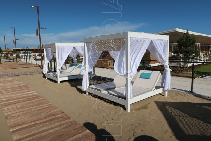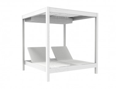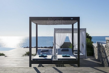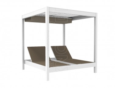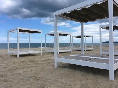 Gazebo composto da resistente telaio in alluminio, ombreggiante in PVC macroforato e tende scorrevoli in acrilico tinto in massa e 2 letti king size . Può essere personalizzato a seconda delle esigenze ed arredare con massimo comfort tutti quegli ambienti dediti a momenti di relax sia diurni che notturni : stabilimenti balneari, hotel, piscine