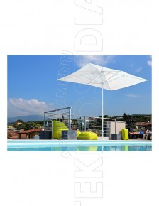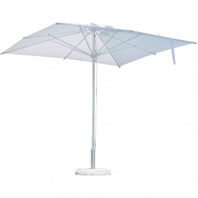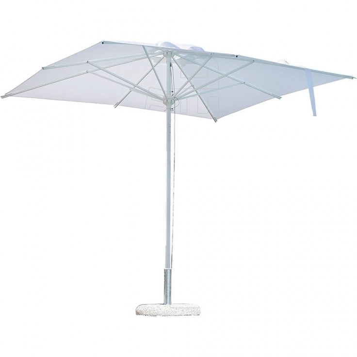 Ombrellone in alluminio colore bianco e telo acrilico 350 di colore bianco, palo centrale con testata a 8 stecche, apertura a carrucola singola con fune in poliestere e nylon, camino antivento .