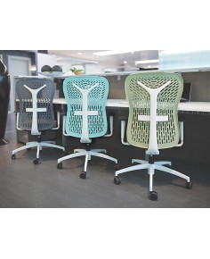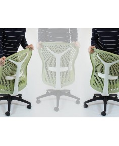 Schienale in polipropilene ad alto modulo, a vista, o imbottita con spugna rivestita in tessuto, con supporto a forma di Y in poliamide con carica di fibra vetro, finitura nera o bianca, con supporto lombare integrato