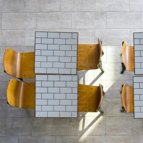 Piano in truciolare E1 a basso contenuto di formaldeide, rivestito in Laminato Decorativo con incisione nera a rettangoli o esagoni. Spessore 30 mm. Bordi in legno o in ABS finitura metallo.