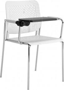 Poltroncina con struttura in metallo, sedile e spalliera in plastica polipropilene di prima stampata. Dotata di tavoletta scrittoio girevole antipanico con carter sottosedile di rinforzo.