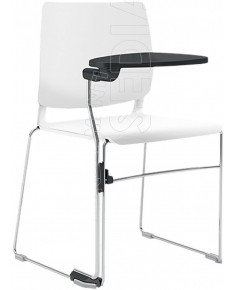 Poltroncina con struttura in metallo, sedile e spalliera in plastica polipropilene di prima stampata. Dotata di tavoletta scrittoio girevole antipanico con carter sottosedile di rinforzo.