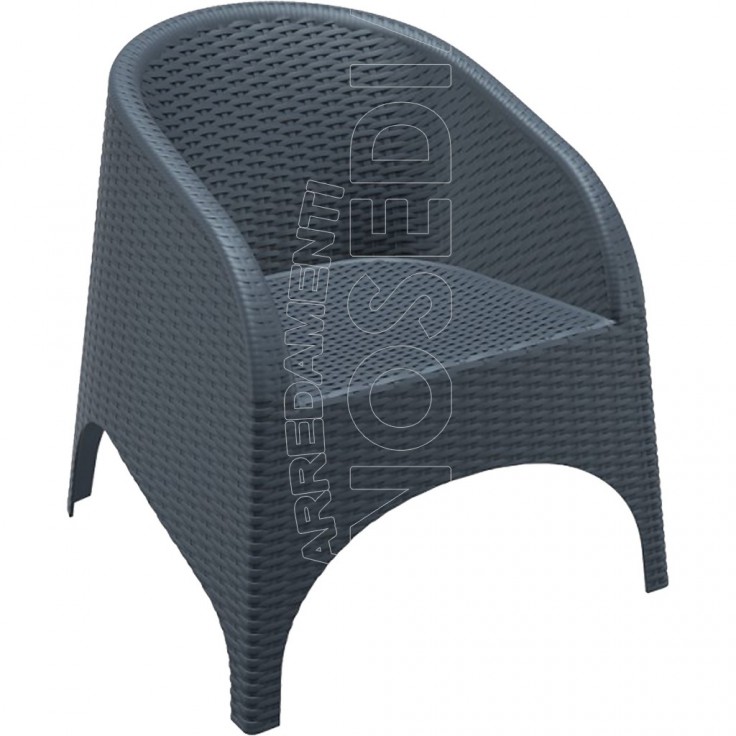 Poltrona impilabile in resina rinforzata in fibra di vetro effetto rattan. Altamente indicata per arredare con gusto ed eleganza gli spazi all'aperto di Bar, Ristoranti, Pizzerie, Caffetterie, Alberghi, Locali. Per uso interno ed esterno.