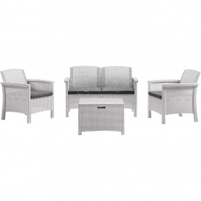 Salotto in prolipropilene stampato motivo rattan per uso inteno ed esterno in polipropilene. Composta da: n°2 Poltrone con schienale alto ed ergonomico n°1 Sofà 2 posti n°1 Tavolino porta cuscini n°4 Cuscini Estremamente solido, robusto, resistente al graffio, ai raggi UV, totalmente waterproof.