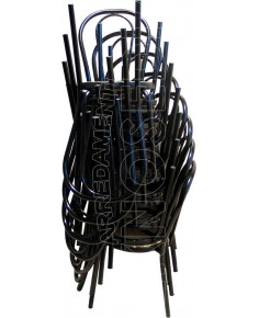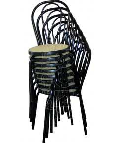 Sedia sovrapponibile con telaio interamente metallico in tubo tondo. Sedile ad incastro in plastica polipropilene motivo fintapaglia.