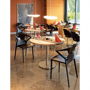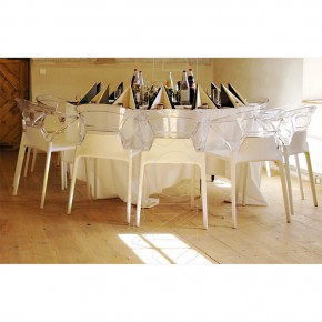 Poltrona impilabile con scocca in polipropilene rinforzato con fibra di vetro e schienale in policarbonato lucido o trasparente. Moderna e di design, si adatta ad ogni tipo di ambiente: caffè, ristoranti, hotels, locali, sale di attesa, uffici. Per uso interno ed esterno