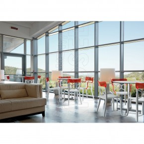 Sedia impilabile con seduta in polipropilene rinforzato in fibra di vetro e schienale in policarbonato trasparente o lucido. Seduta dalla linea tradizionale ma con un design moderno e contemporaneo. Adatta per arredare caffè, bar, ristoranti, sale meeting, sale di attesa, sale per eventi, catering. Per uso interno ed esterno