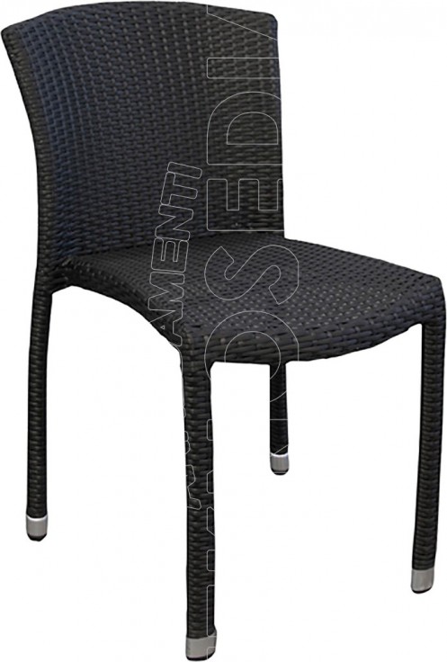 Sedia impilabile in alluminio effetto rattan. Altamente indicata per arredare con gusto ed eleganza gli spazi all'aperto di Bar, Ristoranti, Pizzerie, Caffetterie, Alberghi, Locali. Per uso interno ed esterno.