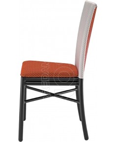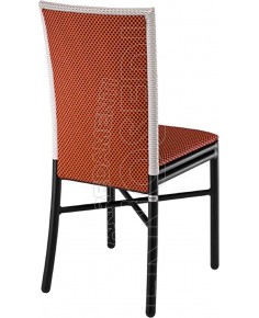 Sedia con telaio in Alluminio verniciato finitura rattan rivestito in Tessil, resistente agli agenti atmosferici, non trattiene lo sporco, facile da pulire. Munita di sedile imbottito per esterno ricambiabile.
