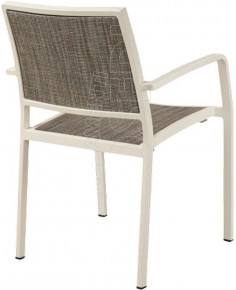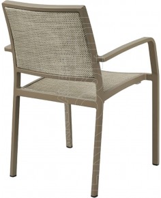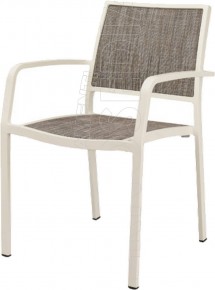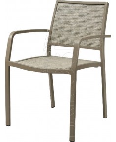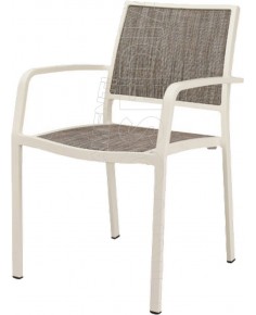 Poltrona con telaio in Alluminio verniciato rivestito in Tessil resistente a strappi, mantiene inalterato il colore nel tempo, facile da pulire. Munita di schienale e sedile ricambiabili nel tempo.