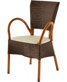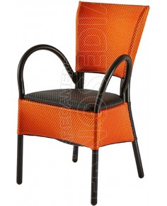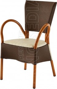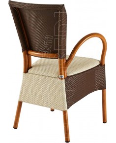 Poltrona con telaio in Alluminio verniciato finitura rattan rivestito in Tessil caratterizzata da un design elegante e raffinato poiché impilabile e munita di sedile imbottito per esterno ricambiabile.
