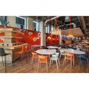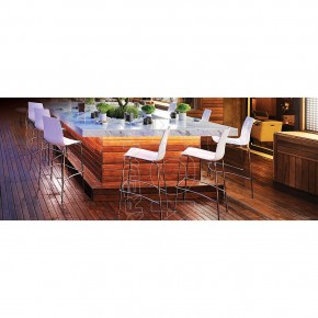 Sgabello impilabile con scocca in polipropilene, policarbonato o imbottita con struttura in tubo di acciaio cromato o verniciato. Seduta dalla linea fluida, contemporanea. Adatto per arredare caffè, bar, ristoranti, hotels, locali. Per uso interno ed esterno